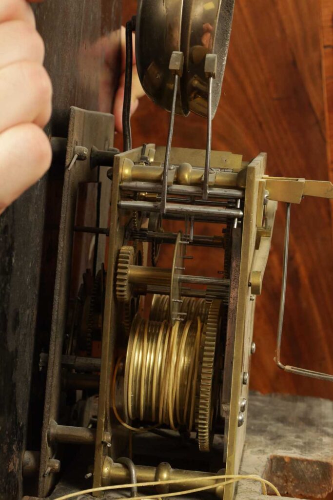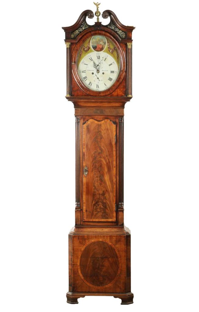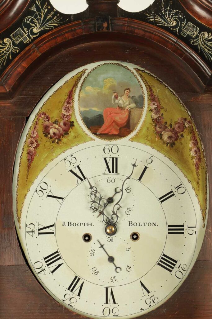 J. BOOTH, BOLTON. A GEORGE III FLAMED MAHOGANY PAINTED OVAL DIAL EIGHT-DAY QUARTER STRIKING LONGCASE CLOCK with oval painted dial above a Roman chapter ring with seconds and date dials, an eight-day weight driven movement with anchor escapement, striking the quarters on two bells. The case with swan-neck pediment above reeded Corinthian columns to the hood and cross-banded trunk door with reeded columns and oval panelled base with ogee bracket feet.