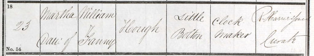William Hough, was listed as a Clock Maker of Sharples Bolton, when he married in 1852. He had a daughter with his Wife Fanny Hunt, Martha, Baptised on 23rd March 1856, when he was listed as a Clockmaker.